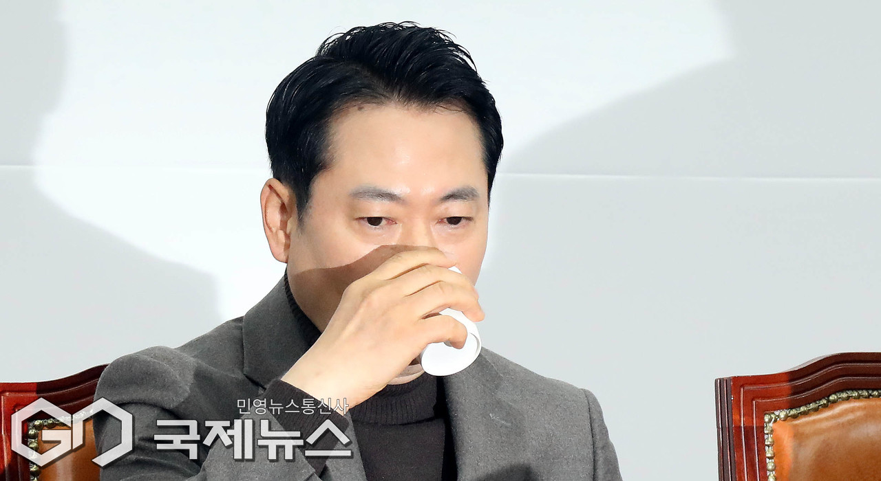 (서울=국제뉴스) 장동혁 국민의힘 대표가 18일 서울 여의도 국회에서 열린 최고위원회의에서 물을 마시고 있다./사진=이용우 기자