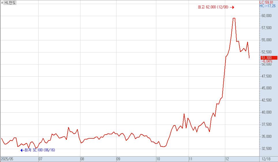 17일 금융투자업계에 따르면 HL만도 주가는 최근 한 달 사이 가파른 상승세를 보였다. 지난달 24일 4만 원 언저리에 있던 주가는 이달 들어 50% 가까이 급등했다. 11일 열린 ‘CEO 인베스터 데이(CID)’를 기점으로 회사가 제시한 로봇 사업 로드맵과 중장기 전략이 투자심리에 불을 지핀 것으로 풀이된다.