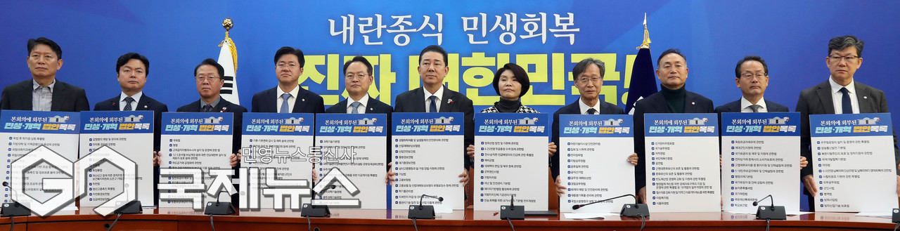 (서울=국제뉴스) 김병기 더불어민주당 원내대표와 참석자들이 18일 오전 서울 여의도 국회에서 열린 정책조정회의에서 '민생, 개혁법안을 가로막는 국민의힘 규탄' 퍼포먼스를 하고 있다./사진=이용우 기자