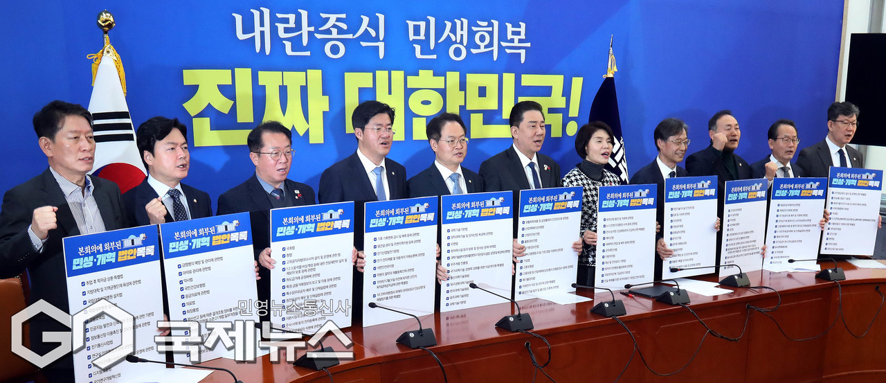 (서울=국제뉴스) 김병기 더불어민주당 원내대표와 참석자들이 18일 오전 서울 여의도 국회에서 열린 정책조정회의에서 '민생, 개혁법안을 가로막는 국민의힘 규탄' 퍼포먼스를 하고 있다./사진=이용우 기자