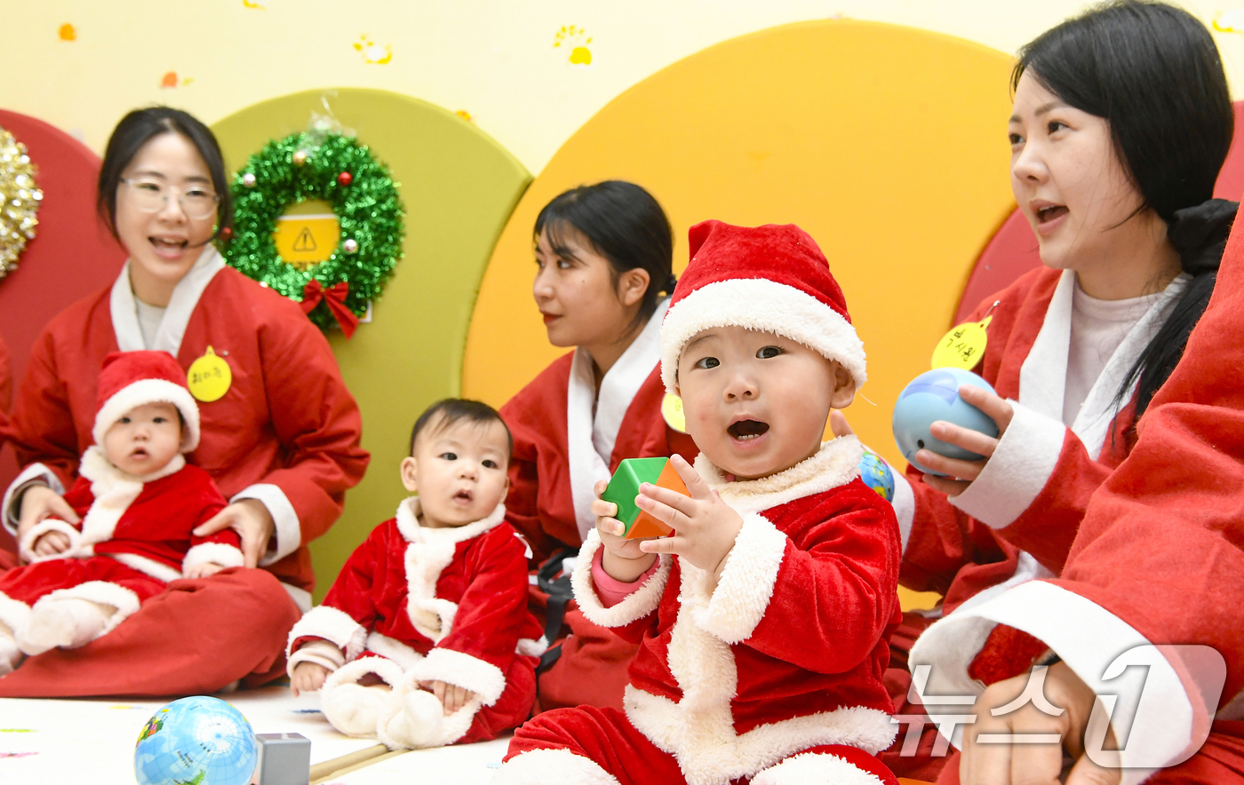 (경기광주=뉴스1) 김영운 기자 = 크리스마스를 일주일 앞둔 18일 경기 광주시 능평도서관에서 산타 복장을 입은 엄마와 아기들이 놀이를 하고 있다. (공동취재) 2025.12.18/뉴스1