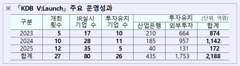 올해 3년차에 접어들며 국내 대표 지역특화 벤처플랫폼으로 자리잡은 KDB V:Launch는 이번 행사까지 총 27회 개최됐고, 총 80개의 지역 혁신기업이 IR을 실시, 이 중 26개사가 총 2188억원(산업은행 투자 435억원 포함)의 투자유치에 성공하는 등 가시적인 성과를 내고 있다. KDB V:Launch는 벤처기업(Venture)의 가치(Value)와 성공(Victory)를 쏘아올리는 발사(Launch)대 의미를 담고 있다.