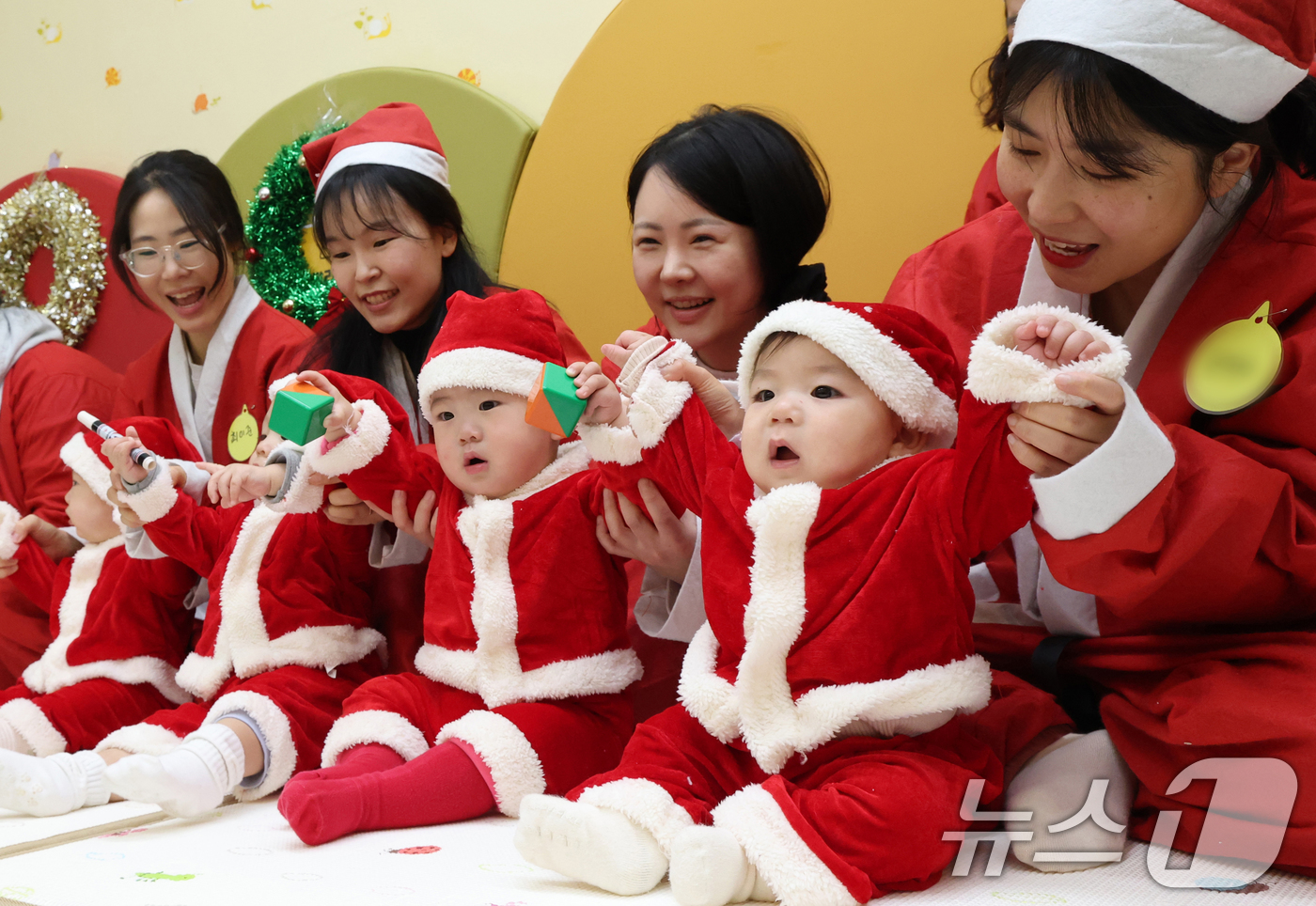 (경기광주=뉴스1) 김영운 기자 = 크리스마스를 일주일 앞둔 18일 경기 광주시 능평도서관에서 산타 복장을 입은 엄마와 아기들이 놀이를 하고 있다. 2025.12.18/뉴스1
