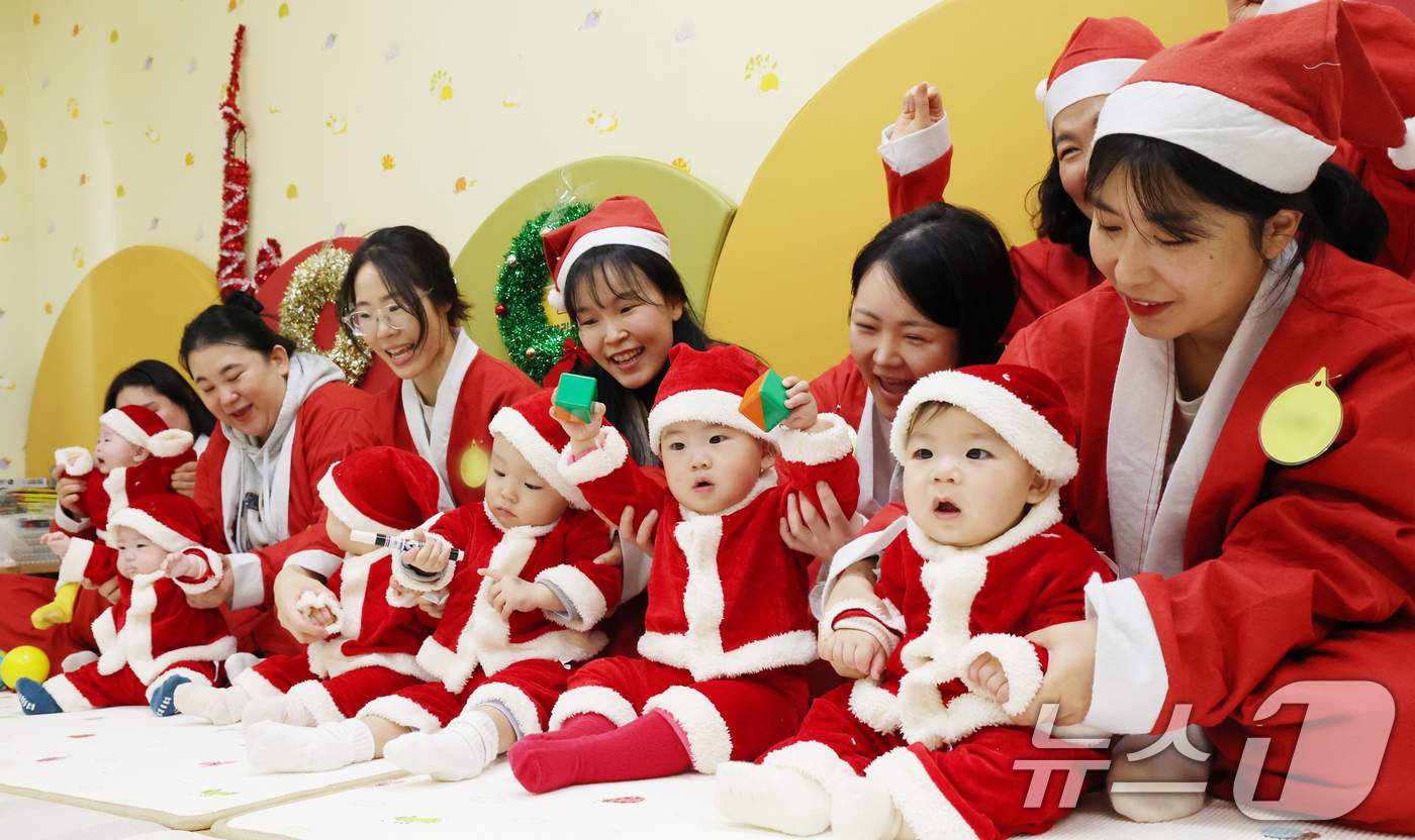 (경기광주=뉴스1) 김영운 기자 = 크리스마스를 일주일 앞둔 18일 경기 광주시 능평도서관에서 산타 복장을 입은 엄마와 아기들이 놀이를 하고 있다. 2025.12.18/뉴스1