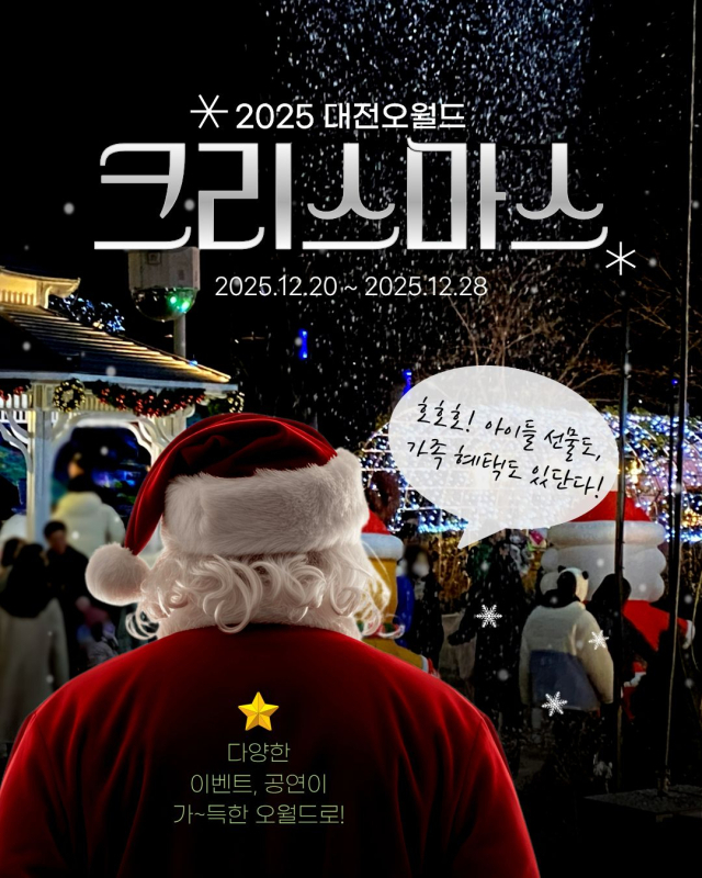 한상헌 대전오월드 원장은 “크리스마스를 맞아 가족과 함께 웃음과 추억을 나눌 수 있는 시간을 마련했다”며 “대전오월드에서 따뜻하고 행복한 연말을 보내시기 바란다”고 말했다.