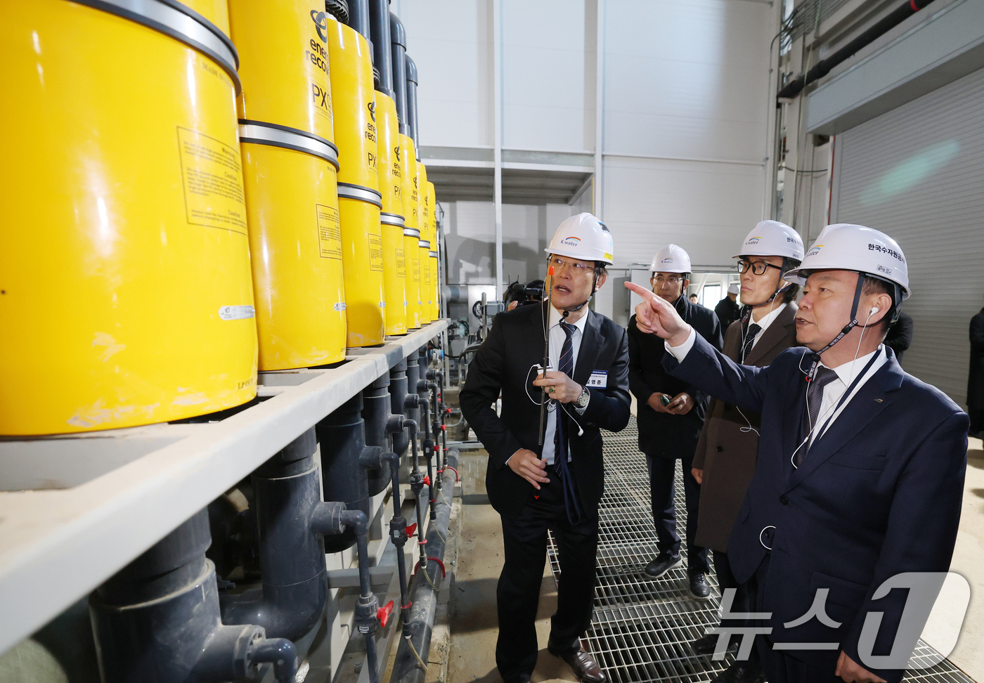 (서산=뉴스1) 김기태 기자 = 윤석대 한국수자원공사 사장이 금한승 기후에너지환경부 1차관, 이완섭 서산시장과 18일 충남 서산 대산해담 플랜트부지에서 열린 대산임해산업지역 해수담수화사업 준공식을 마치고 플랜트 시설을 시찰하고 있다. 대산임해해수담수화 사업은 대산임해산업지역의 신규 산단, 공장 증설 등의 용수 수요 증가에 대비해 서해를 수원으로 하고 역삼투(RO) 기술을 적용해 하루 10만㎥ 규모의 공업용수를 생산하는 해수담수화 플랜트를 건설하는 사업이다. 2025.12.18/뉴스1