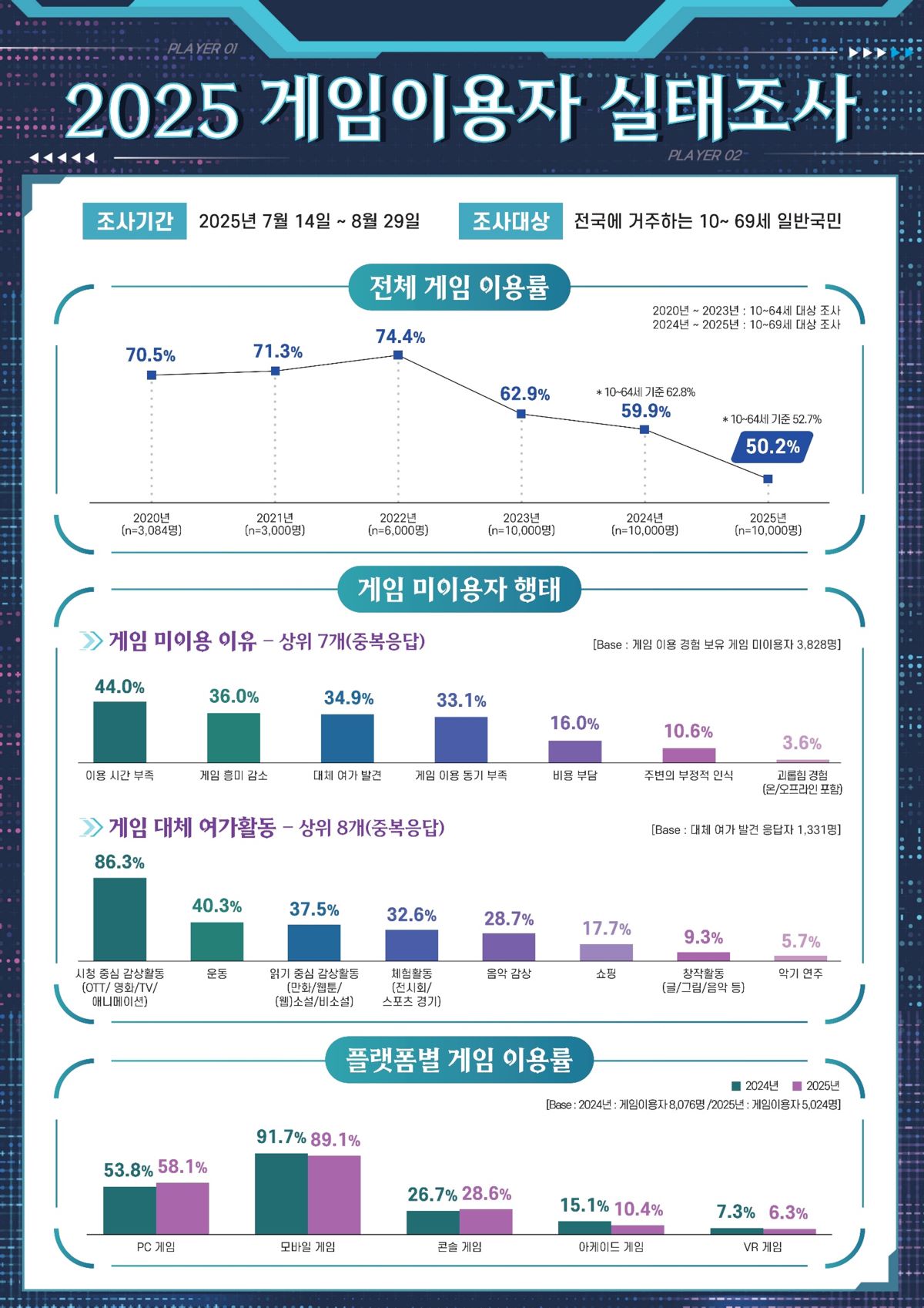 조사 결과 최근 1년간 게임 이용률은 50.2%로 전년 대비 9.7%p 감소했으며, 최근 5년 연평균성장률(CAGR)은 -6.8%로 하락 추세로 나타났다. 게임이용자 중 ▲PC 게임 이용률은 58.1%로 전년 대비 4.3%p ▲콘솔 게임 이용률은 28.6%로 1.9%p 증가한 반면, ▲모바일 게임 이용률은 89.1%로 전년 대비 2.6%p 감소했다.