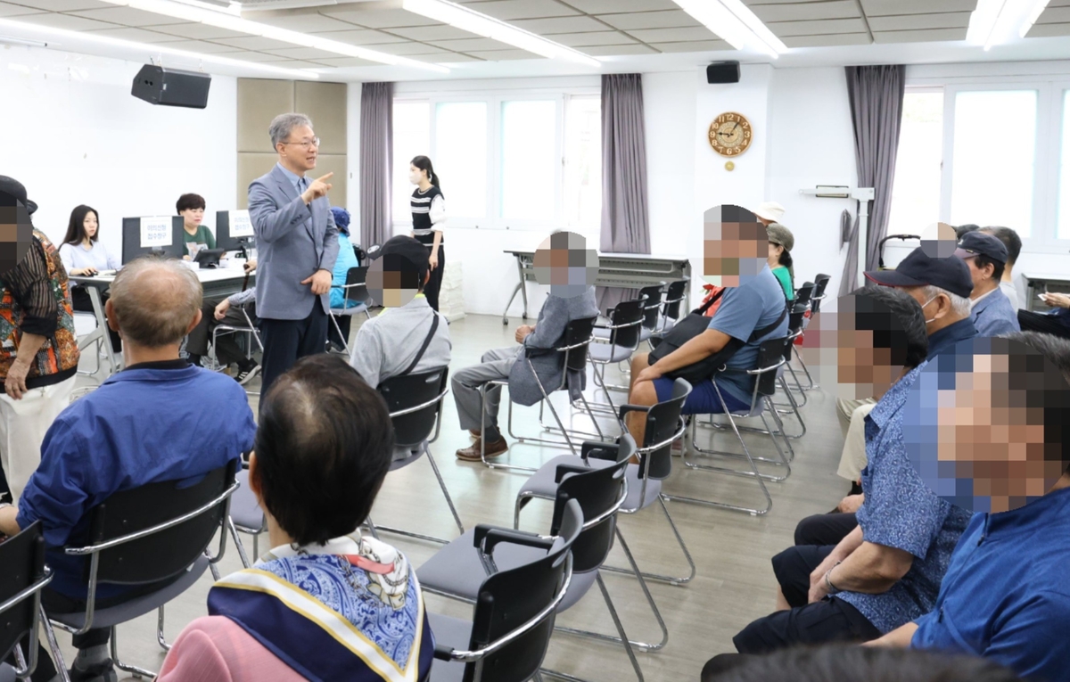 장인홍 구로구청장이 주민 어르신들에게 소비쿠폰 신청방법 등을 설명하는 모습. 구로구 제공 |