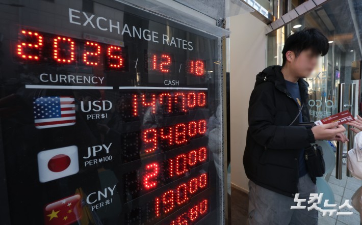 원·달러 환율이 고공행진을 이어가고 있는 가운데 18일 서울 명동 거리의 한 환전소에 환율이 표시되어 있다. 전날(17일) 원·달러 환율이 장중 1480원을 넘어서면서 8개월 만에 최고치를 기록했다.