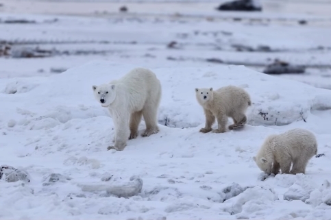 영상에는 눈 덮인 풍경을 살피는 두 마리 새끼와 뒤쪽을 서성이는 어미의 모습, 새끼 한 마리가 다른 곰들 곁으로 급히 달려가는 모습 등이 담겼다.
