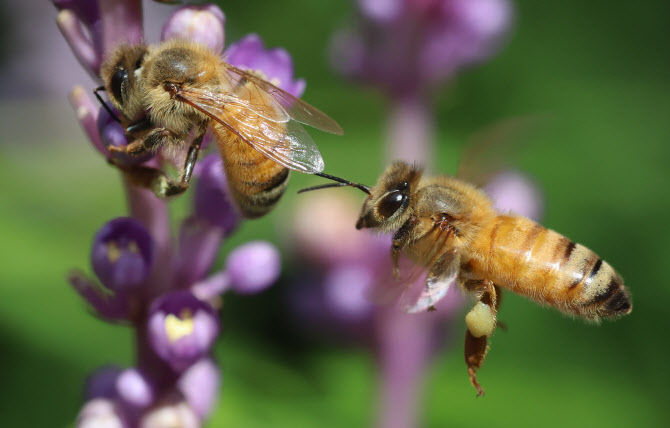 8월 26일 오전 제주 서귀포시 남원읍 휴애리 자연생활공원에서 꿀벌이 맥문동 꽃에서 꿀을 따고 있다.(사진=연합뉴스) |