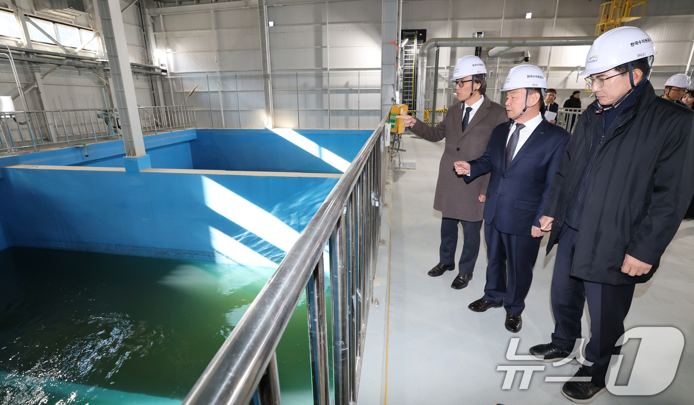 (서산=뉴스1) 김기태 기자 = 윤석대 한국수자원공사 사장이 금한승 기후에너지환경부 1차관, 이완섭 서산시장과 18일 충남 서산 대산해담 플랜트부지에서 열린 대산임해산업지역 해수담수화사업 준공식을 마치고 플랜트 시설을 시찰하고 있다. 대산임해해수담수화 사업은 대산임해산업지역의 신규 산단, 공장 증설 등의 용수 수요 증가에 대비해 서해를 수원으로 하고 역삼투(RO) 기술을 적용해 하루 10만㎥ 규모의 공업용수를 생산하는 해수담수화 플랜트를 건설하는 사업이다. 2025.12.18/뉴스1