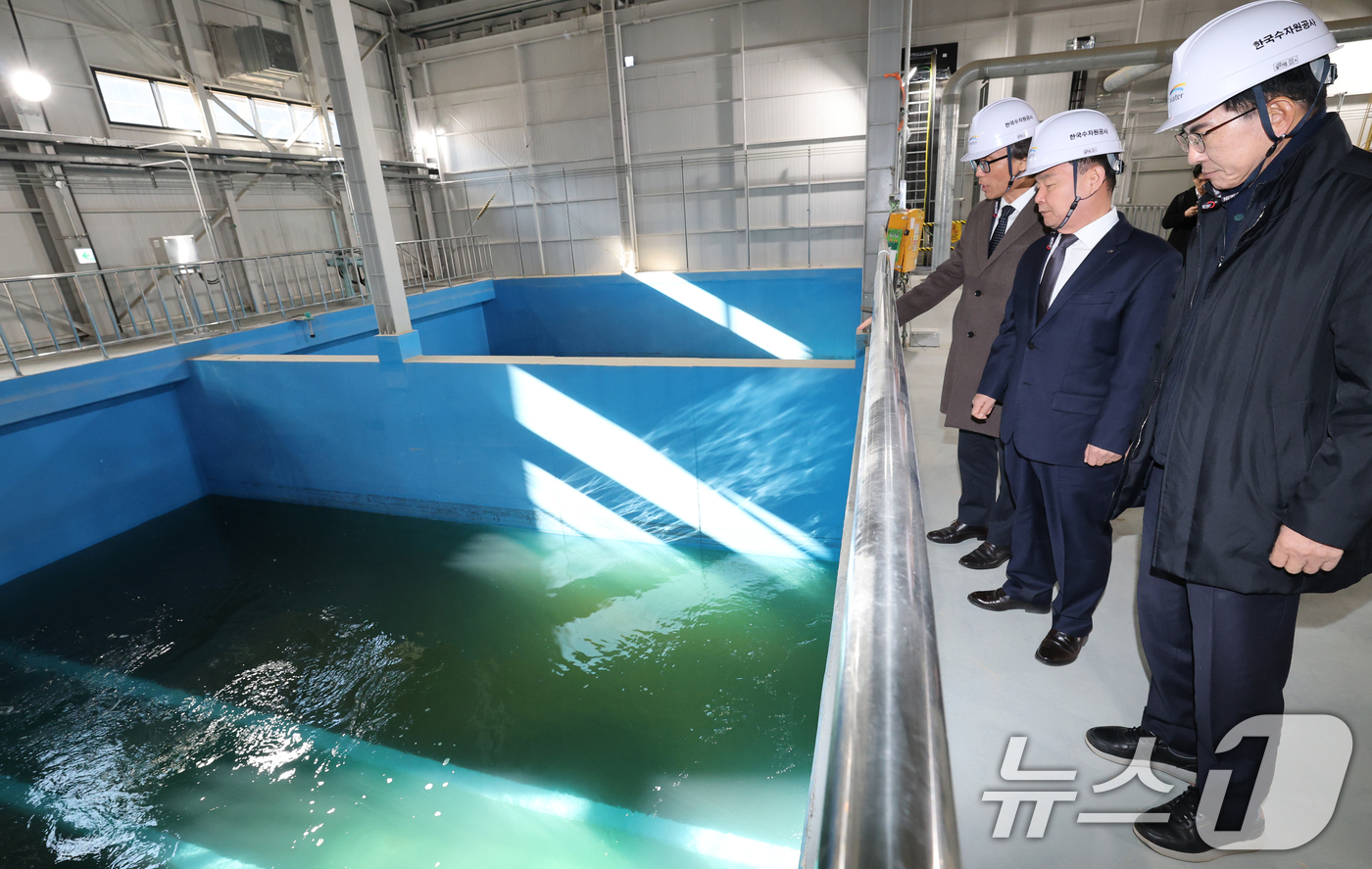 (서산=뉴스1) 김기태 기자 = 윤석대 한국수자원공사 사장이 금한승 기후에너지환경부 1차관, 이완섭 서산시장과 18일 충남 서산 대산해담 플랜트부지에서 열린 대산임해산업지역 해수담수화사업 준공식을 마치고 플랜트 시설을 시찰하고 있다. 대산임해해수담수화 사업은 대산임해산업지역의 신규 산단, 공장 증설 등의 용수 수요 증가에 대비해 서해를 수원으로 하고 역삼투(RO) 기술을 적용해 하루 10만㎥ 규모의 공업용수를 생산하는 해수담수화 플랜트를 건설하는 사업이다. 2025.12.18/뉴스1