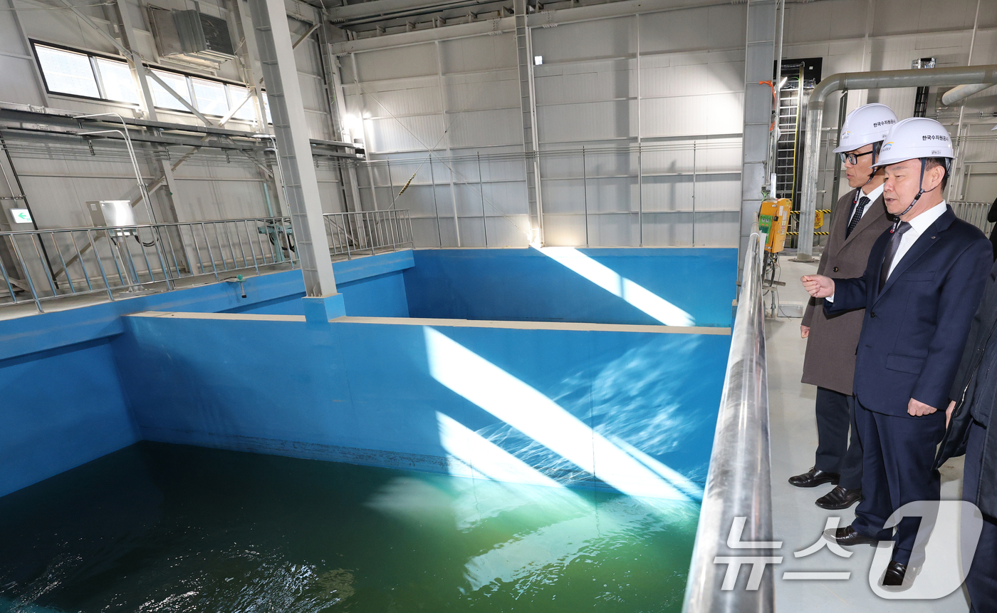 (서산=뉴스1) 김기태 기자 = 윤석대 한국수자원공사 사장이 금한승 기후에너지환경부 1차관, 이완섭 서산시장과 18일 충남 서산 대산해담 플랜트부지에서 열린 대산임해산업지역 해수담수화사업 준공식을 마치고 플랜트 시설을 시찰하고 있다. 대산임해해수담수화 사업은 대산임해산업지역의 신규 산단, 공장 증설 등의 용수 수요 증가에 대비해 서해를 수원으로 하고 역삼투(RO) 기술을 적용해 하루 10만㎥ 규모의 공업용수를 생산하는 해수담수화 플랜트를 건설하는 사업이다. 2025.12.18/뉴스1
