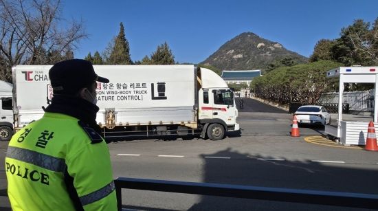 용산 대통령실의 청와대 복귀가 가까워지면서 검문검색이 한층 강화된 가운데 18일 오후 이삿짐을 실은 대형 차량들이 청와대본관으로 이동하고 있다.