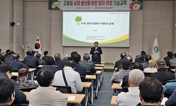 경북 성주군(군수 이병환)이 지난 17일, 농업기술센터 2층 대강당에서 관내 사과재배 농가 100여명을 대상으로 '고품질 사과 생산을 위한 정지·전정 기술교육'을 실시하고 있다.사진=성주군(포인트경제) |