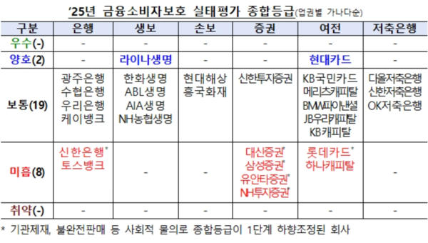 '보통' 등급을 받은 금융사는 우리은행, 케이뱅크, 한화생명, KB국민카드, NH농협생명 등 19개사이며, '미흡' 등급은 신한은행, 토스뱅크, 대신증권, 삼성증권, 유안타증권, NH투자증권, 롯데카드, 하나캐피탈 등 8개사로 나타났다.