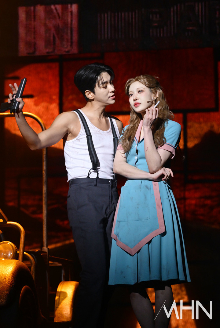 (MHN 이지숙 기자) 배우 윤현민, 홍금비가 18일 오후 서울 종로구 홍익대 대학로 아트센터에서 열린 뮤지컬 '보니 앤 클라이드' 프레스콜에 참석해 시연을 선보이고 있다.