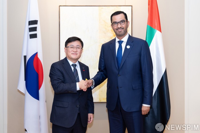 [서울=뉴스핌] 김성환 기후에너지환경부 장관이 18일 서울 중구 롯데호텔에서 술탄 아흐마드 알 자베르 아랍에미리트(UAE) 산업첨단기술부 장관과 양자 회담에 앞서 기념촬영을 하고 있다. [사진=기후에너지환경부] 2025.12.18 photo@newspim.com |