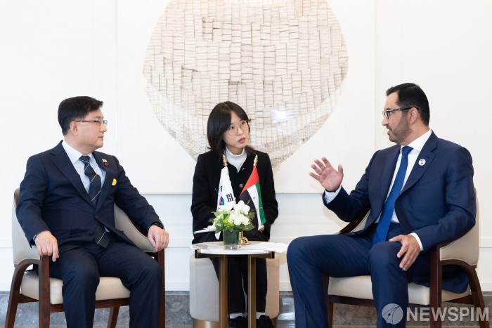 [서울=뉴스핌] 김성환 기후에너지환경부 장관이 18일 서울 중구 롯데호텔에서 술탄 아흐마드 알 자베르 아랍에미리트(UAE) 산업첨단기술부 장관과 양자 회담을 하고 있다. [사진=기후에너지환경부] 2025.12.18 photo@newspim.com