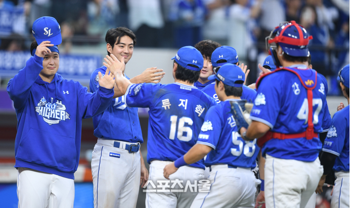 삼성 선수들이 14일 대구 삼성라이온즈파크에서 열린 2025 KBO리그 SSG와 준플레이오프 4차전에서 SSG에 5-2로 승리하며 3승 1패로 플레이오프 진출을 확정한 뒤 함께 세리머니를 하고 있다. 대구 | 박진업 기자 upandup@sportsseoul.com |