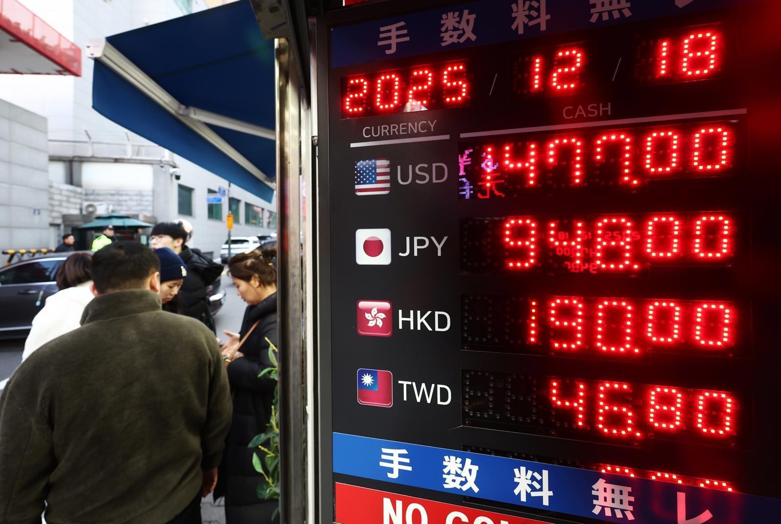 원·달러 환율이 연일 고공행진 하고 있는 18일 오전 서울 시내의 환전소에서 외국인 관광객들이 환전을 하고 있다. 전날 원·달러 환율은 8개월 만에 장중 1480원을 돌파했다. 2025.12.18 뉴스1 |
