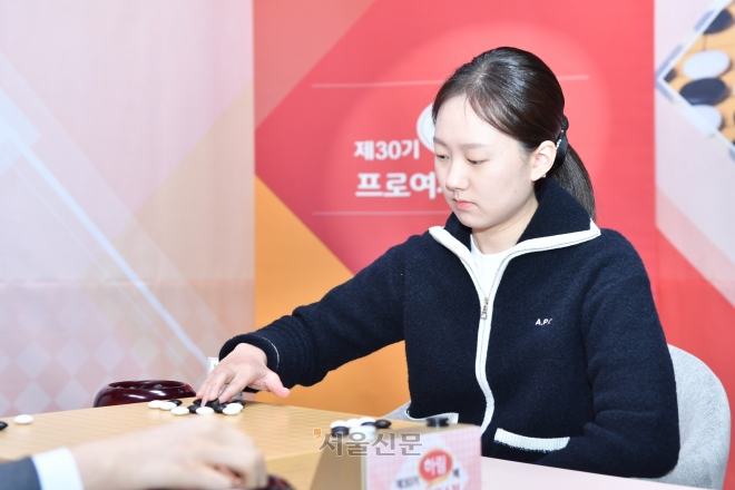 김은지 9단이 18일 서울 성동구 한국기원 바둑TV 스튜디오에서 열린 제30기 하림배 프로여자국수전 결승 3번기 3국에서 최정 9단과 승부를 펼치고 있다. 한국기원 제공 |