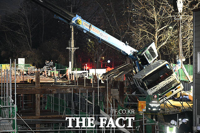 [더팩트ㅣ박헌우 기자] 18일 오후 서울 송파구 잠실대교 남단 나들목(IC) 연결체계 개선공사 현장에 크레인이 쓰러져 있다.