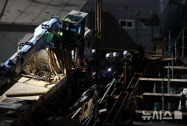 [서울=뉴시스] 이영환 기자 = 18일 오후 서울 송파구의 공사장 인근에서 크레인이 전도되는 사고가 발생했다. 이 사고로 작업하던 노동자 1명이 크레인에 깔려 구조됐으나 사망 추정인 상태로 파악됐다. 사진은 사고 현장. 2025.12.18. 20hwan@newsis.com
