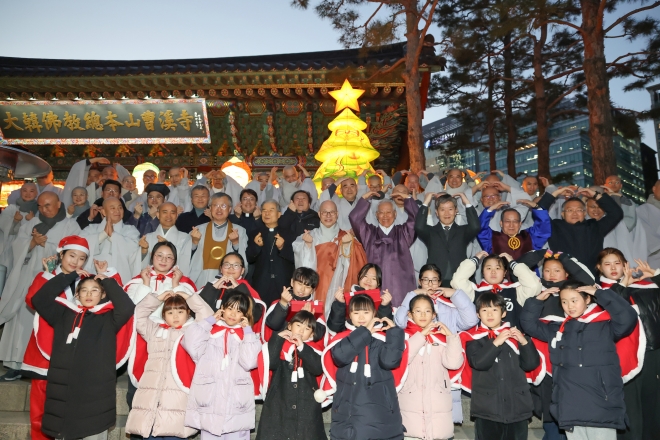 서울 종로구 조계사에서 열린 크리스마스 트리 점등식 뒤 종교계 지도자 등 참석자들이 기념사진을 찍고 있다. 조계종 제공. |