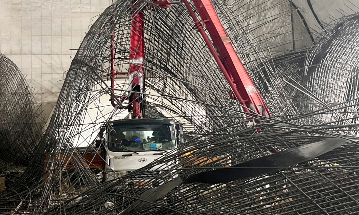 18일 오후 포스코이앤씨가 시공하는 서울 여의도역 신안산선 공사 현장 지하 70m 지점에서 철근이 낙하해 콘크리트 타설 작업 중이던 차량을 덮치면서 주변 철근들이 휘어져 있다. 이 사고로 노동자 7명이 매몰됐는데, 이 중 1명은 숨졌고 구조된 6명 중 2명이 경상을 입었다.