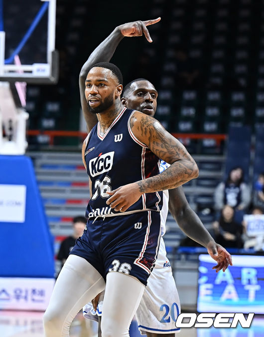 [OSEN=부산, 이석우 기자] 18일 부산 사직체육관에서 2025-2026 LG전자 프로농구 부산 KCC와 대구 한국가스공사의 경기가 열렸다.지난 경기에서 복귀했던 최준용이 다시 부상으로 결장하고, 장재석까지 부상으로 이탈한 KCC는 가용 인원이 크게 줄어 한국가스공사전에서 적잖은 어려움이 예상된다.대구 한국가스공사 라건아가 3점슛을 성공시키고 세리머니를 하고 있다. 2025.12.18 / foto0307@osen.co.kr |