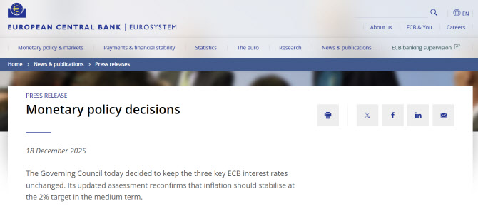 유럽중앙은행(ECB)이 금리를 동결하기로 결정했다.(자료=유럽중앙은행 웹사이트) |