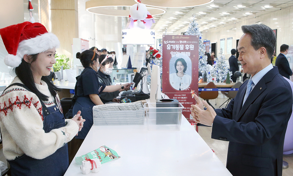 진옥동(오른쪽) 신한금융그룹 회장이 18일 서울 중구 신한금융 본점 ‘카페스윗’에서 배우 장나라씨에게 ‘수어’로 직접 커피를 주문하고 있다. 신한금융이 청각장애인들의 전문 직업교육과 일자리 창출을 지원하는 카페스윗은 이날 유기동물 보호를 위한 기부활동의 일환으로 유기동물 후원 일일카페를 운영했다. 진 회장은 이날 행사에서 수어로 커피를 주문해 장애에 대한 존중의 의미를 더했다.