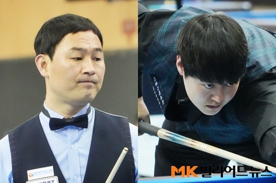 개인 통산 두 번째 우승을 노리는 최완영(왼쪽)과 이범열이 제천 청풍호배 남자3쿠션 128강에서 각각 김동석과 조준혁을 물리치고 64강에 올랐다. |