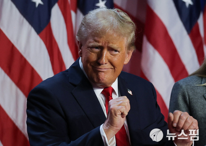 11월 6일(현지시간) 공화당 대선 후보 도널드 트럼프 전 대통령이 플로리다주 웨스트 팜 비치의 팜 비치 카운티 컨벤션 센터에서 대선 조기 결과 발표 후 연설하고 춤을 추고 있다.[사진=로이터 뉴스핌] |