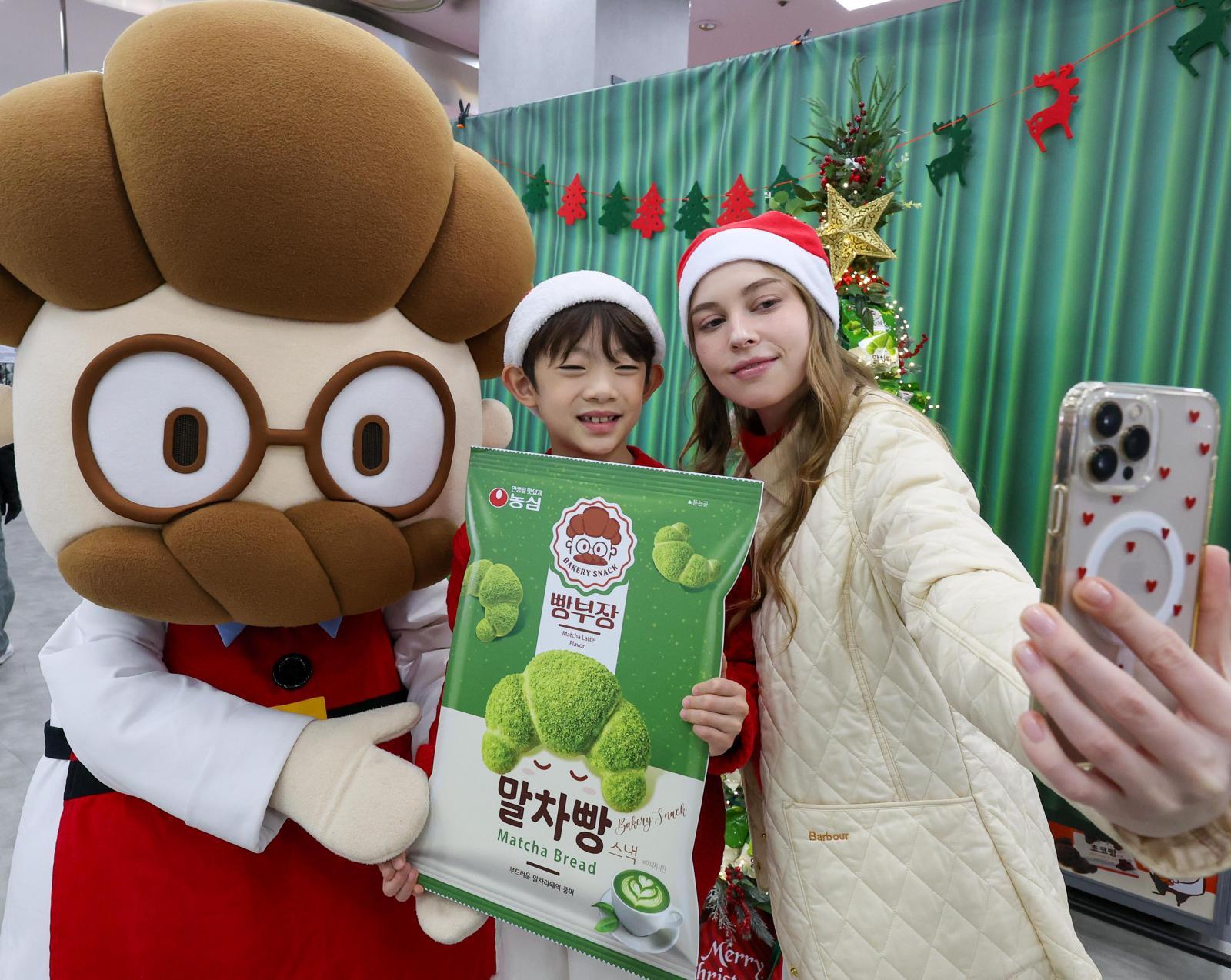 18일 서울 중구 롯데마트 제타플렉스 서울역점에서 모델들이 새로 나온 농심 베이커리 스낵 빵부장 시리즈인 ‘빵부장 말차빵’을 소개하고 있다. 빵부장 말차빵은 국산 제주 말차 파우더로 진한 풍미를 살려 말차 라테 맛을 구현한 것이 특징이다.