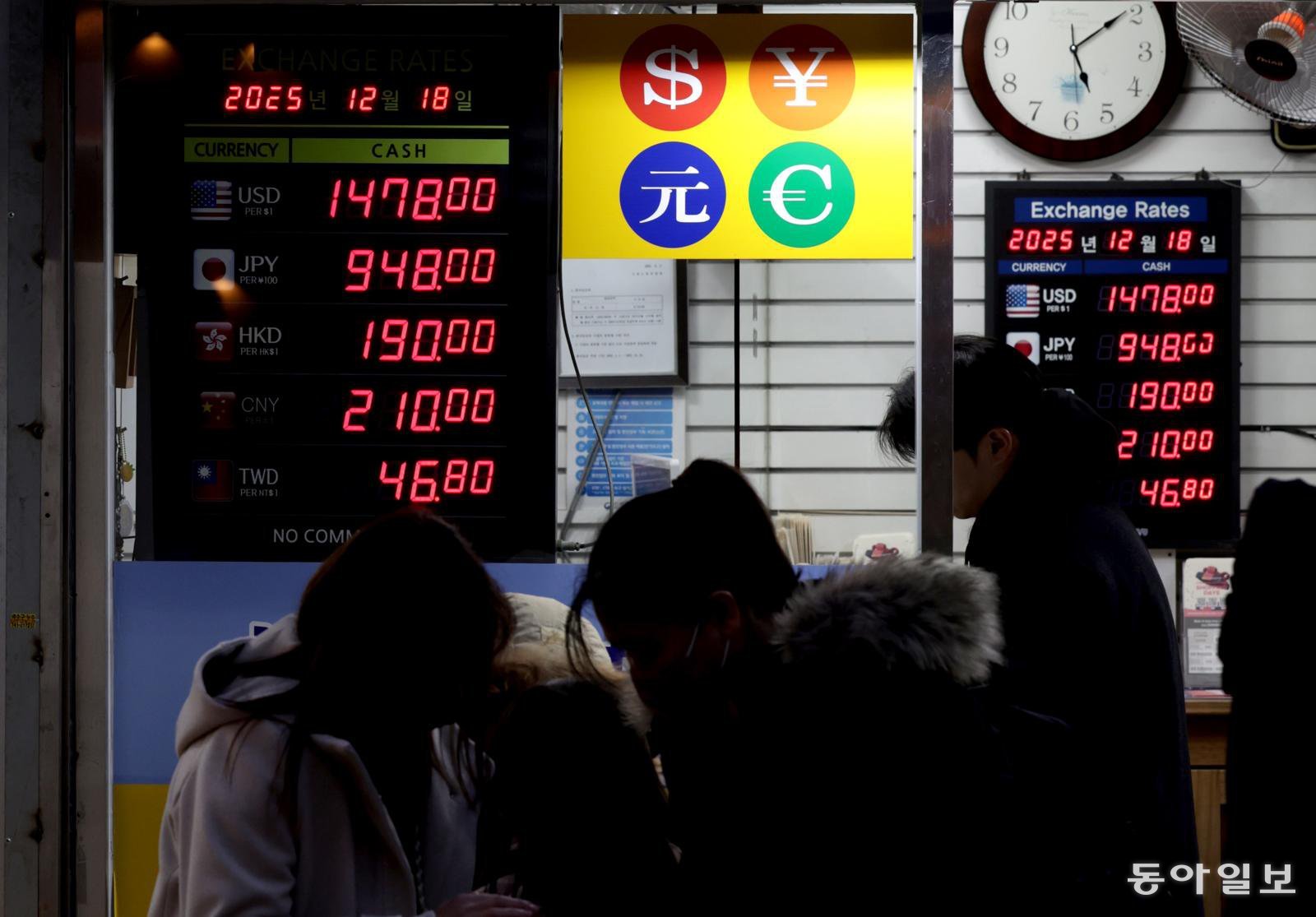 18일 서울 외환시장에서 원-달러 환율은 1478.3원으로 주간 거래를 마쳤다. 전날 대비 1.5원 하락(원화 가치는 상승)하긴 했지만 여전히 높은 수준을 유지했다. 전날에는 장중 1480원대까지 치솟기도 하며 12월(1∼18일) 월간 평균 환율은 1472.2원으로 나타났다. 외환위기 시기였던 1998년 3월(1488.87원) 이후 27년 9개월 만에 가장 높은 수준이다.