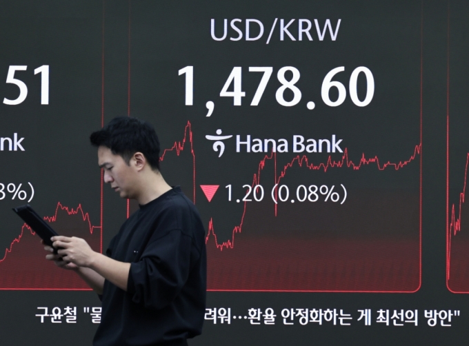 18일 오후 서울 중구 하나은행 본점 딜링룸 전광판에 달러·원 환율이 전일 주간종가 대비 1.2원(0.08) 내린 1478.6원을 나타내고 있다. (서울=뉴스1) |
