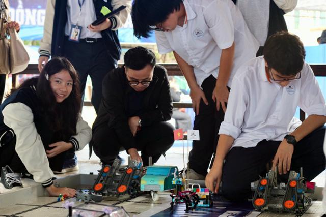 지난 13일 베트남 하노이에서 열린 'AI 포 굿 베트남(AI for Good Vietnam)' 행사에서 학생들이 자신이 만든 로봇으로 경주를 하고 있다. 하노이=허경주 특파원 |