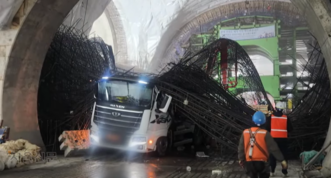 18일 서울 여의도역 인근 신안산선 공사 현장에서 철근 구조물이 무너지며 콘크리트 타설차를 덮친 모습. 이 사고로 작업자 1명이 숨지고 1명이 다쳤다. YTN 유튜브 캡처 |