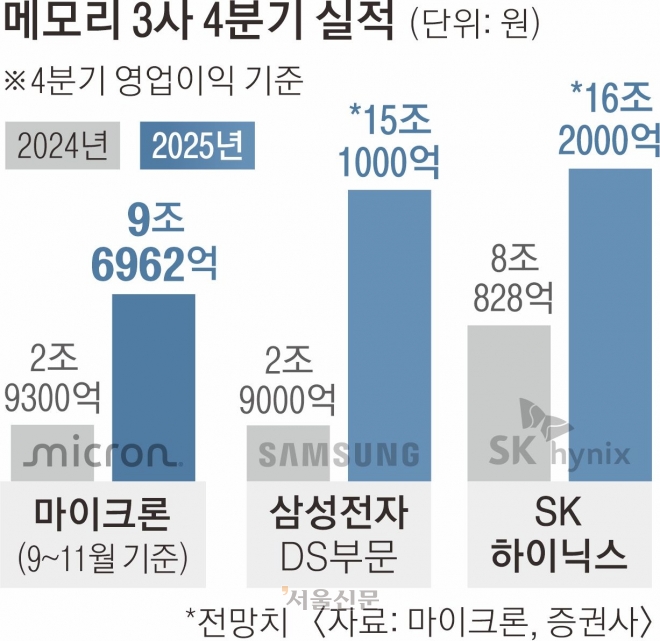 마이크론의 선전은 국내 업계에도 대형 호재다. 글로벌 D램 시장은 삼성전자·SK하이닉스·마이크론 3사가 매출의 90% 이상을 점유하는 과점 구조로, HBM 양산이 가능한 곳도 이들뿐이다. 증권가는 삼성전자 반도체(DS) 부문의 올해 4분기 영업이익을 15조원 안팎으로, SK하이닉스는 16조원대 중반으로 전망하고 있다. 양사의 분기 합산 영업이익이 30조원을 넘어설 것이라는 관측이 지배적이다.