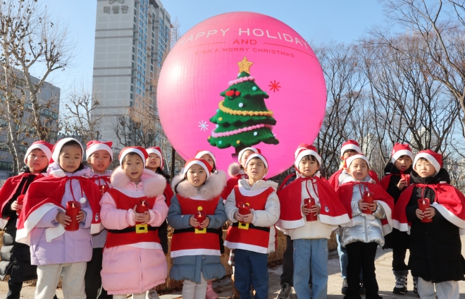 서울 송파구 석촌호수의 미디어 아트 조형물 ‘더 스피어’ 앞에서 18일 산타 복장을 한 송파구청 어린이집 원생들이 크리스마스캐럴을 부르고 있다. 송파구는 오는 31일까지 더 스피어에서 크리스마스와 새해를 주제로 한 미디어 아트를 상영한다.