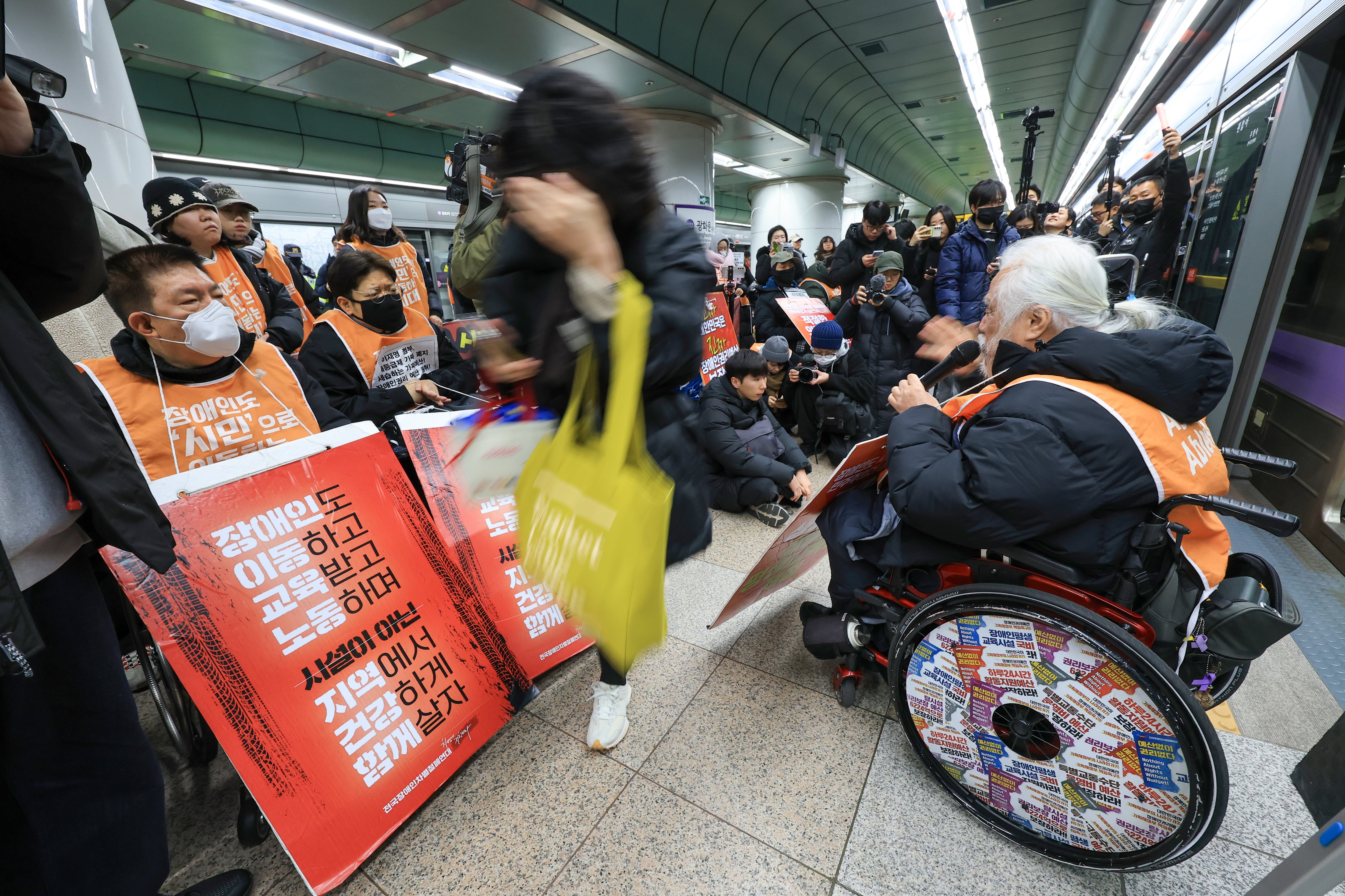한 예로 지난 11일 전장연은 서울 지하철 4호선 혜화역에서 출근길 시위를 열었다. 휠체어에 탄 채로 승강장을 찾은 이들은 지하철 문을 막아섰다. 그러자 서울교통공사는 오전 8시 39분부터 8시 59분까지 20분간 무정차 통과를 시행했다. 지난달 18일에도 전장연은 5호선 광화문역을 찾아 기습 시위를 했고, 상행선과 하행선 열차 모두 정차하지 않고 통과했다.