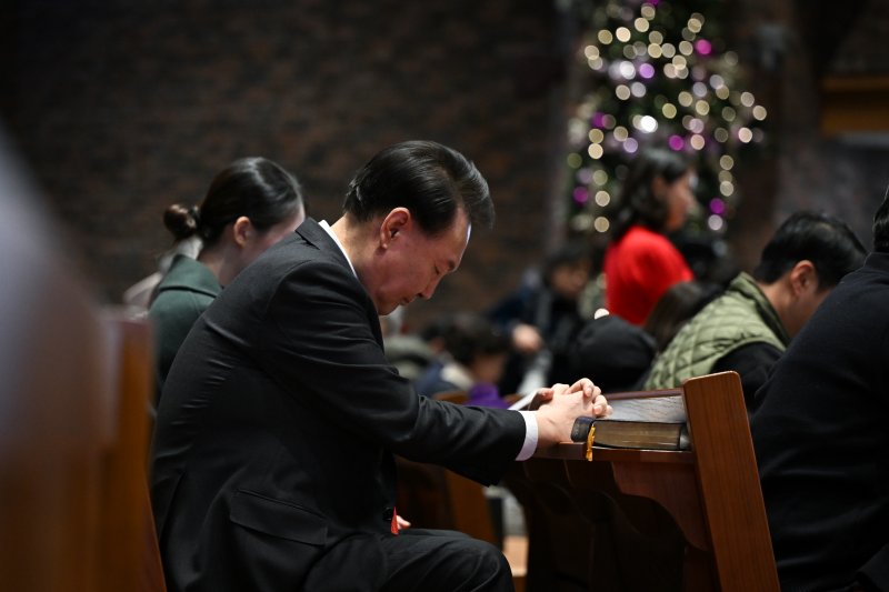 지난 2023년 12월 25일 당시 윤석열 대통령이 서울 중구 정동제일교회에서 열린 성탄 예배에 참석해 기도하고 있다. 대통령실 제공./사진=연합뉴스