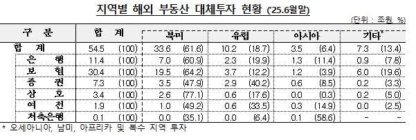 금융권별로는 보험업권이 30.4조원으로 가장 큰 비중(55.7%)을 차지했으며, 은행 11.4조원(21.0%), 증권 7.3조원(13.4%), 상호금융 3.4조원(6.2%), 여신전문금융회사 1.9조원(3.6%), 저축은행 0.1조원(0.2%) 순으로 나타났다. 총자산 대비 해외 부동산 대체투자 비중은 보험이 2.3%로 가장 높았고, 증권 0.9%, 상호금융과 여전이 각각 0.4%, 은행 0.3%, 저축은행 0.1% 수준이었다.