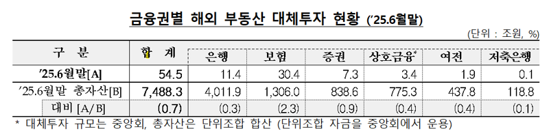 19일 금융감독원이 발표한 '금융회사 해외 부동산 대체투자 현황'에 따르면 지난 6월 말 기준 금융회사의 해외 부동산 대체투자 잔액은 54조5000억원으로 집계됐다. 전체 자산의 0.7% 수준으로 전분기 대비 1조원 감소했다.