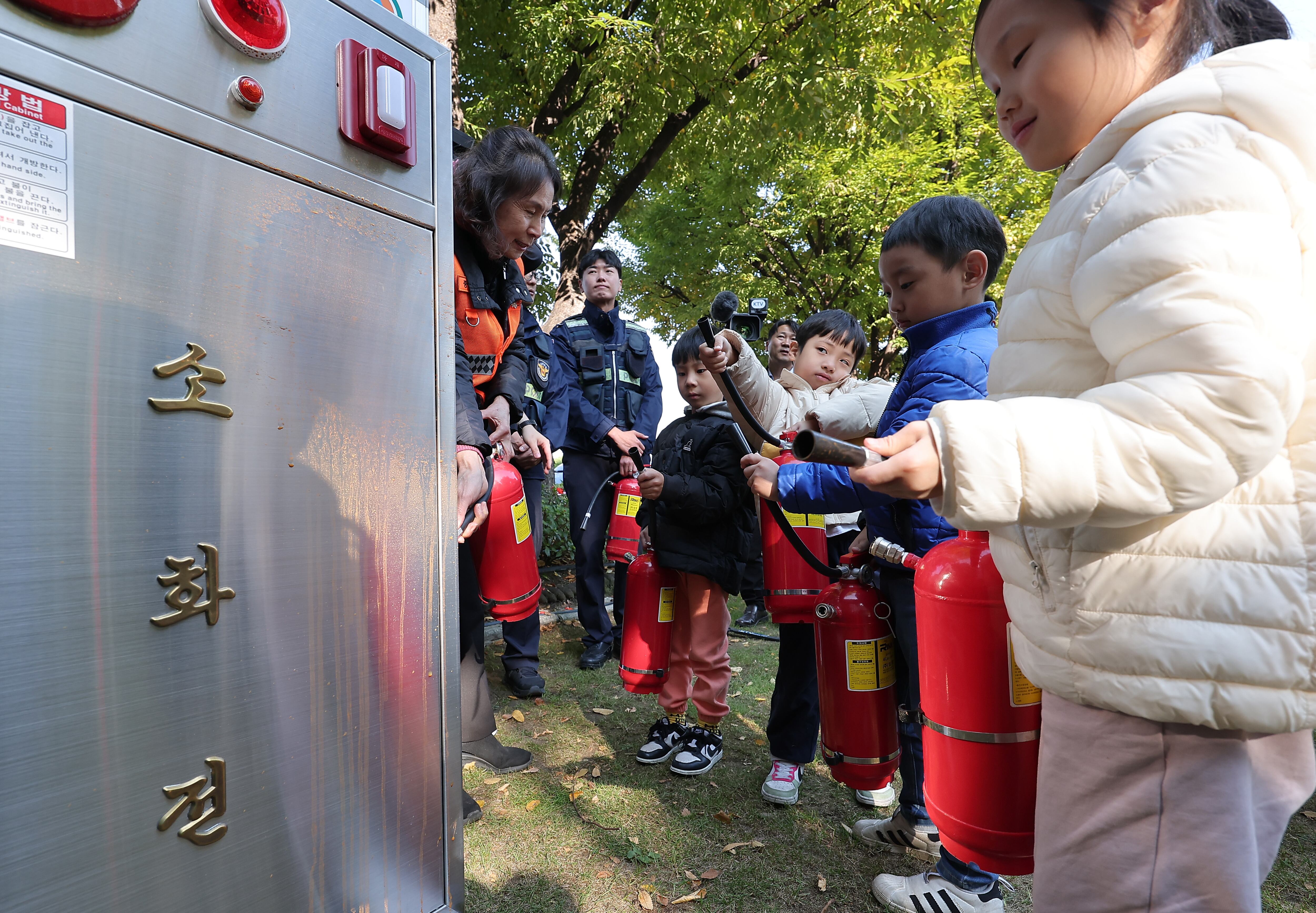 서울 종로구 정부서울청사에서 가을·겨울철 화재 대비 재난 예방과 대응을 위해 진행된 민방위 훈련에서 어린이집 아동들이 소화기 사용법을 체험하고 있다. /뉴스1 |