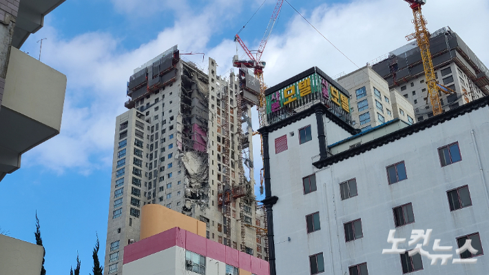 지난 2022년 1월 11일 오후 3시 40쯤 광주 서구 화정아이파크 201동 신축 공사장에서 39층 콘크리트 타설 작업 중 38층이 무너져 하청 노동자 6명이 숨지고 1명이 다쳤다. 김한영 기자 |
