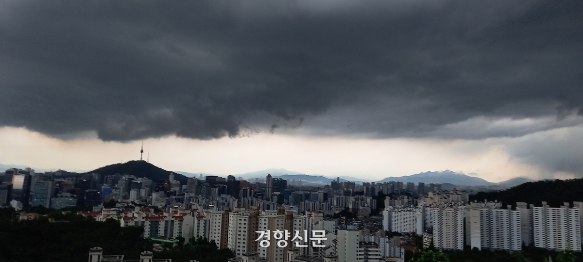 서울 인왕산에서 바라본 상공에 먹구름이 끼어 흐린 날씨를 보이고 있다. 경향신문 자료사진 |
